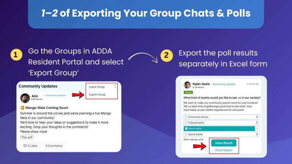 Select the group you want to export the conversation in ADDA Resident Portal.